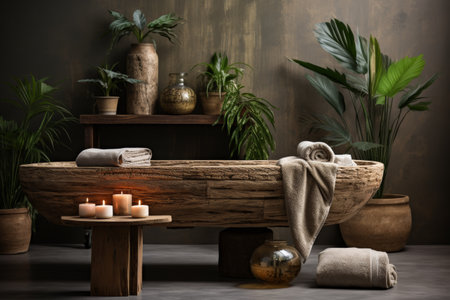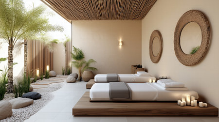 A Relaxing spa interior with wooden beds and natural decor Generative Ai