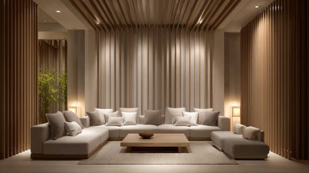 Decorative wall paneling and warm lighting creating depth in a modern living space