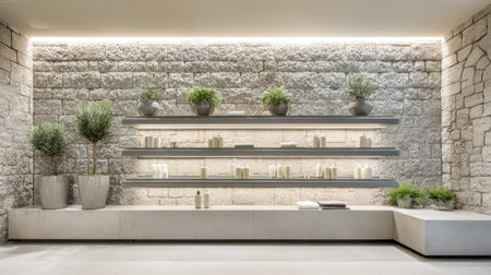 A serene spa interior showcasing minimalist design with natural stone walls and elegant shelving, beautifully arranged with wellness products and greenery.