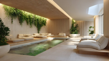 Discover a serene indoor spa featuring modern design and natural elements. Experience tranquility with soothing water, soft lighting, and lush greenery.