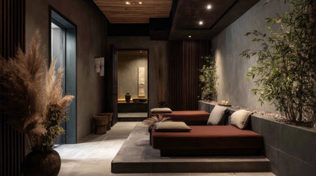 Discover the tranquil interior of a modern spa retreat, featuring a relaxing lounge area adorned with natural elements, soft lighting, and a calming atmosphere.