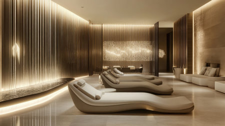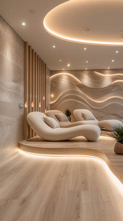 A luxurious spa relaxation room featuring modern design elements with a blend of textured walls, ambient lighting, and ergonomic lounge chairs.