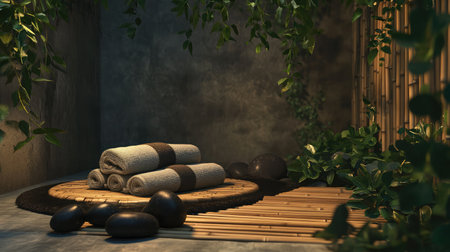 Experience serene tranquility in a spa environment featuring rolled towels, smooth stones, and lush greenery, perfect for relaxation and wellness treatments.