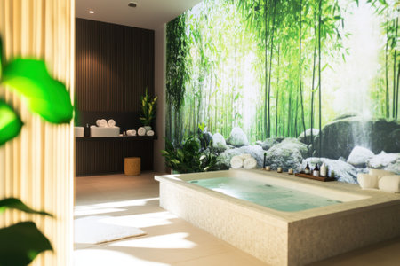 A tranquil spa space featuring a bamboo mural, hot tub, and lush green plants creating a peaceful ambiance.