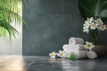 Soft white towels and fresh flowers create a calming atmosphere in a peaceful spa setting, ideal for relaxation.
