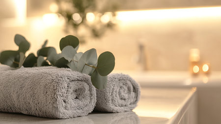 A serene bathroom setting showcases elegant decor with neatly stacked towels minimalist accessories and natural elements. Soft lighting enhances the calming ambiance of the space.