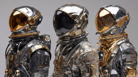 Three astronauts in reflective metallic suits stand together, featuring intricate designs and shiny helmets, representing the future of space exploration and innovation, AI generated