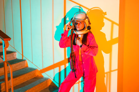 Portrait of a confident young astronaut wearing a colorful sweater and space helmet, posing against a vibrant, geometric backdrop. Ai generated image