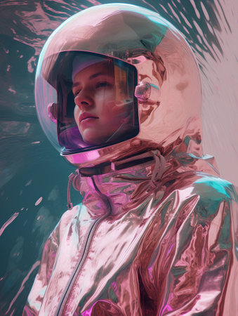 Futuristic spacesuit, astronaut, cyborg. fantasy character action. Portrait of a woman astronaut in a space suit, dreamy look up. AI generated illustration