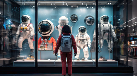 A woman wearing a space suit in front of a store window with innovative space fashion. A woman chooses a space suit in the shopping meta universe. Futuristic Fashion