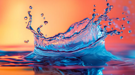 A water crown splash is captured against a vibrant orange and purple background. The image showcases liquid dynamics, with droplets scattered in mid-air. The composition highlights textures and colors using studio lighting to create a visually striking effect, potentially suitable for advertising or design projects.
