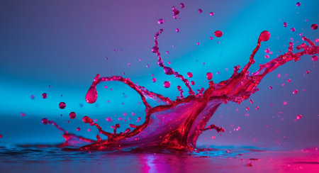 Dynamic splash of water with vibrant pink and blue gradient background, showcasing energy, motion, and fluidity in a modern design.
