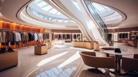Modern clothing store interior with a stylish apparel displays, natural lighting, and spacious layout.