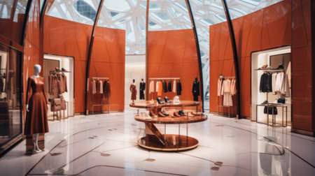 fast fashion store, with mannequins wearing latest trends and recycled materials in the background, created with generative ai