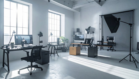 A close - up view of a modern photo studio, showcasing the professional equipment and setup. Generative AI
