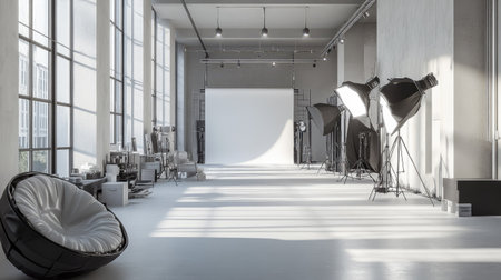A bright photography studio featuring large windows, softbox lights, and a minimalist backdrop, perfect for professional photo shoots and creative projects.