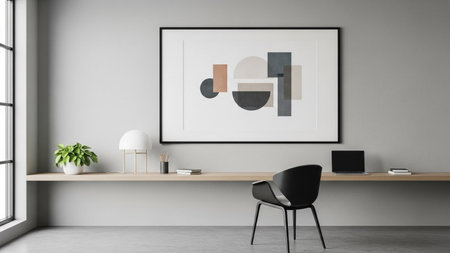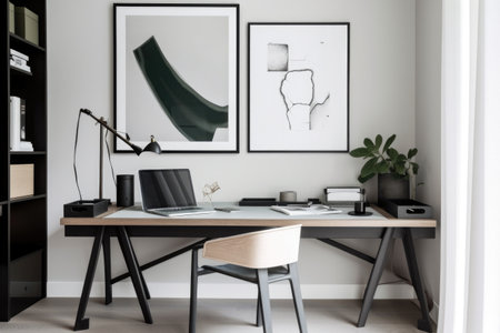 minimalist home office with sleek desk, tasteful decor and inspirational artwork, created with generative ai