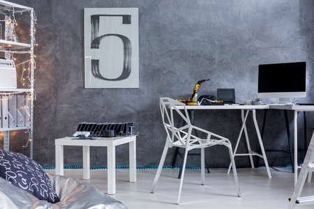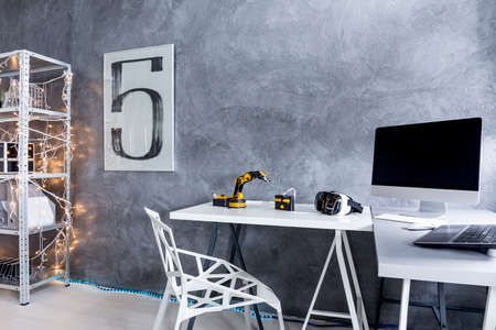New design room in grey with small table, crystal chair, desk and computer