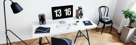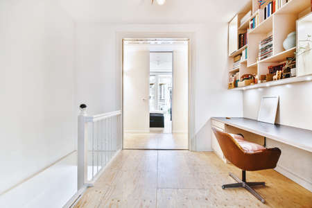 Stylish minimalist workroom with wooden parquet floor