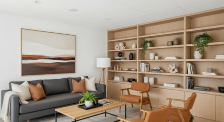 Interior design of Home Office in Scandinavian style with Floating Shelves decorated with Sheepskin Rug, Potted Plants material. Modern architecture. Generative AI AIG24.