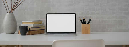 Close up view of simple worktable with mock-up laptop, stationery and books on white desk with white chair
