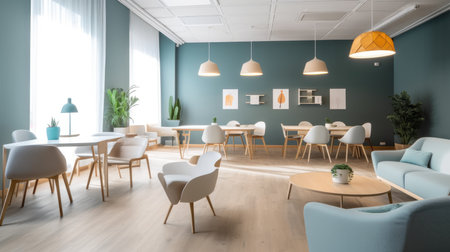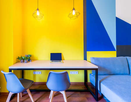 The image showcases a modern office space, featuring a colorful design with contemporary furniture and decor, perfect for advertising or editorial content.
