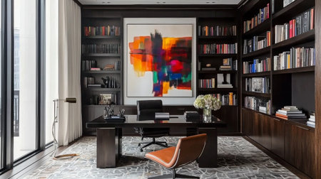 A sleek and modern office space showcasing vibrant abstract artwork, stylish furniture, and a serene atmosphere, perfect for inspiring creativity and productivity.
