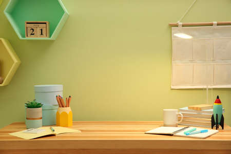 Stylish workplace with stationery on wooden desk near light green wall. Interior design