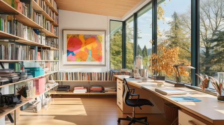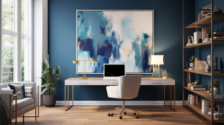 Vibrant home office setting with a desk and chair, enhanced by artwork and lighting fixtures. Empty modern room for work. Generative AI