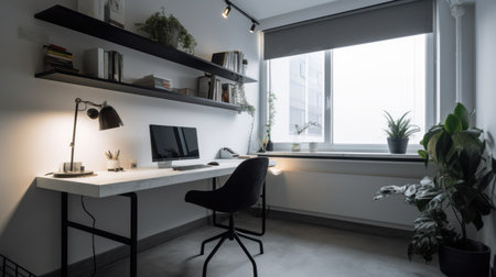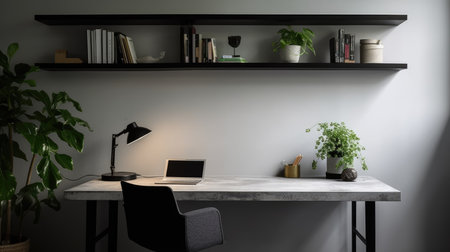 An AI generated illustration of a modern home office space with a computer and decorations