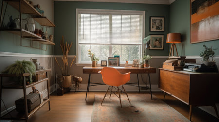 Interior design of Home Office in Mid-century style with Statement Desk decorated with Wood Flooring, Geometric Rug material. Mid-century architecture. Generative AI AIG24.