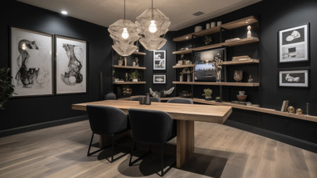 Interior design of Dining Room in Contemporary style with Statement Chandelier decorated with Wood Table, Upholstered Chairs material. Industrial architecture. Generative AI AIG24.