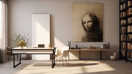 Minimalist office with a bookcase and a large picture of a woman painted in charcoal