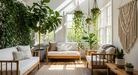 An inviting indoor scene showcases diverse potted plants and greenery by a large window. The space is bathed in natural light, with soft shadows adding depth. It features a cozy seating area and a light-colored palette. Suitable for illustrating home decor, lifestyle, or environmental themes.