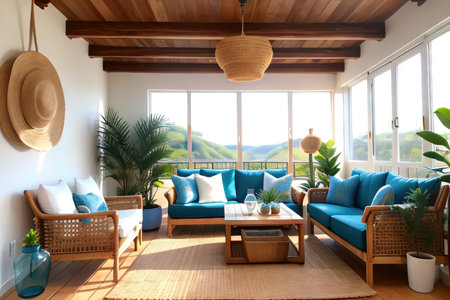 Living room decor, home interior design . Coastal Rustic style with Large Windows decorated with Wood and Wicker material . Generative AI AIG26.