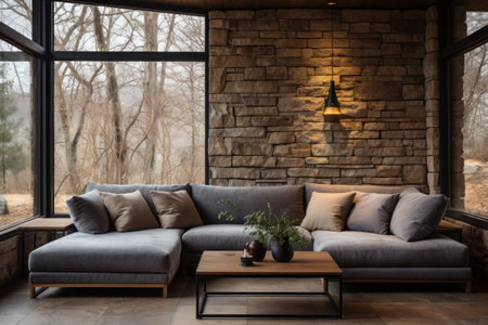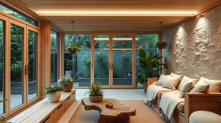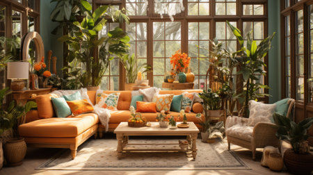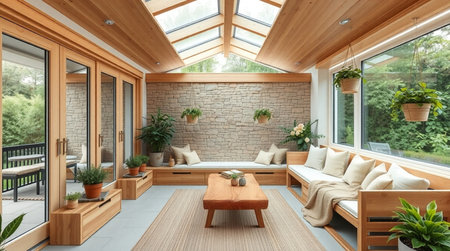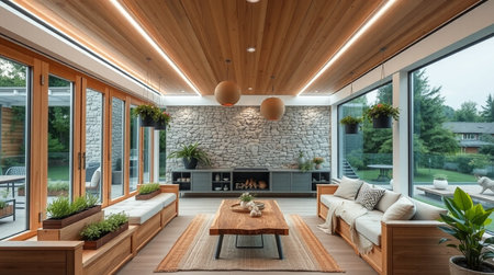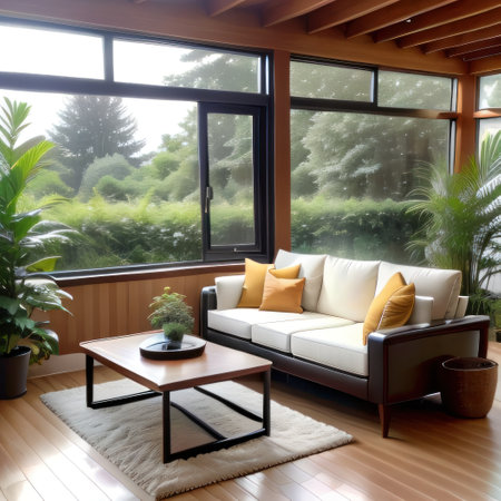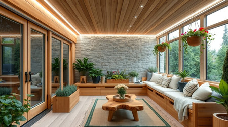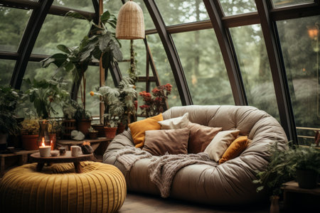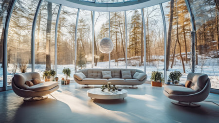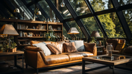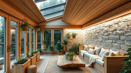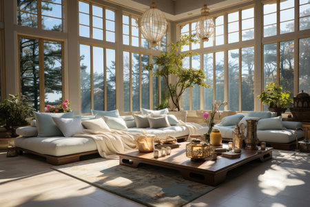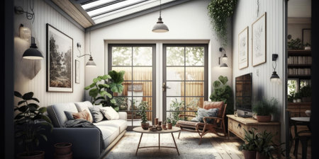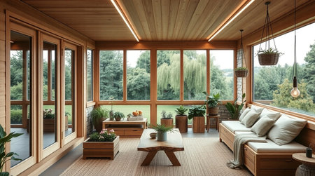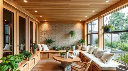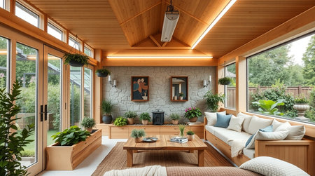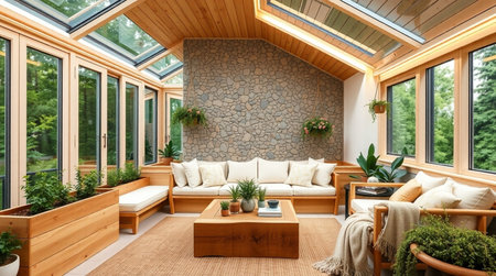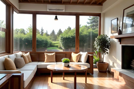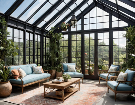 Sunroom A room with large windows or glass walls. AI generated illustration