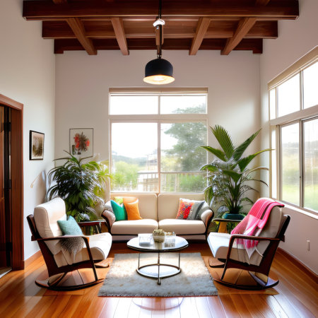 A bright and airy living space filled with natural light, featuring cozy seating, vibrant indoor plants, and a serene view that creates a tranquil atmosphere.