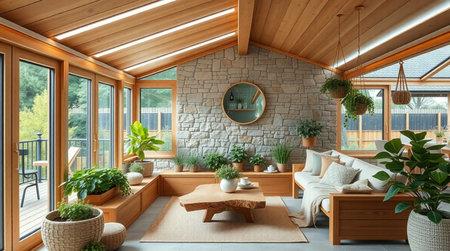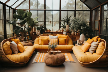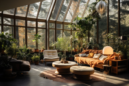 Botanical Bliss: A conservatory with floor-to-ceiling windows, overflowing planters, and a cozy seating area. Alvar Aalto style. Generative AI