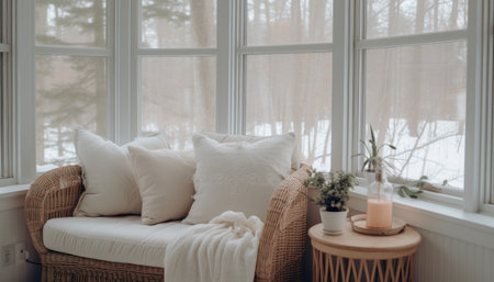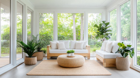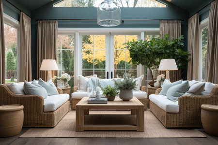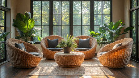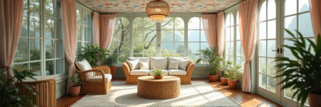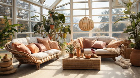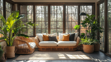 Bright and airy sunroom with wicker furniture and indoor plants. Generative AI technology