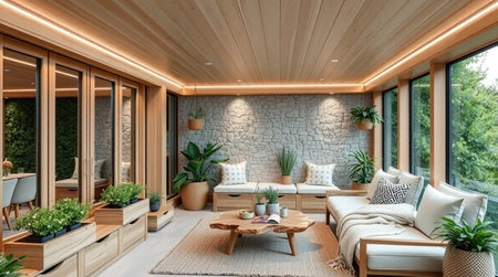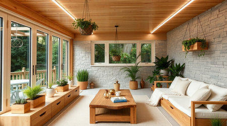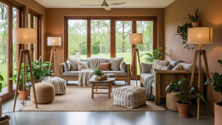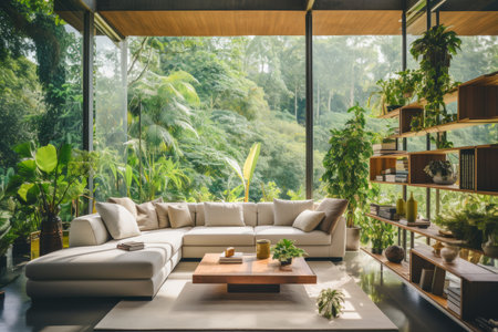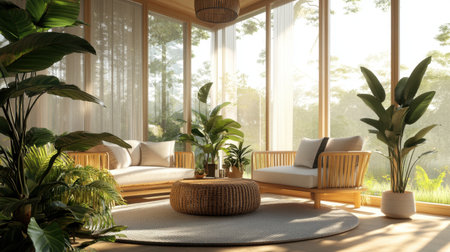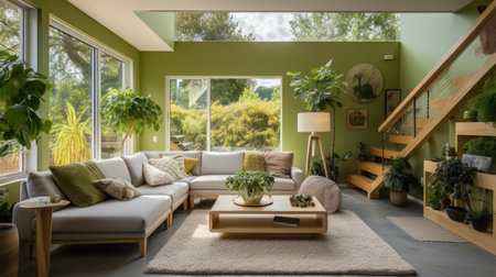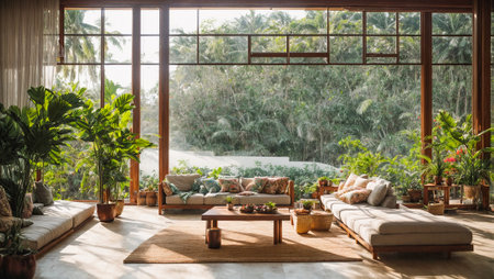 Sunlight filters through large windows into a spacious living room filled with plants. A modern sofa invites relaxation, while nature surrounds the cozy space, promoting tranquility and harmony.