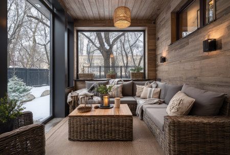 This interior presents a lounge area with wicker furniture and a large window overlooking the outdoors. The space features wooden walls and soft lighting, creating a warm and inviting atmosphere. It suggests comfort and relaxation, suitable for lifestyle or design projects.