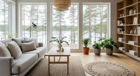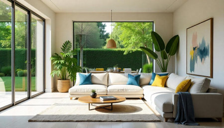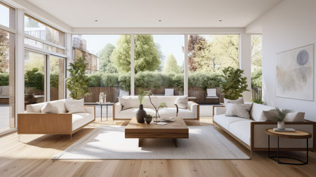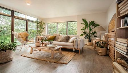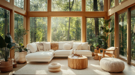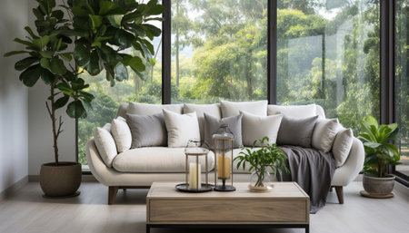 This living room features a cream-colored sofa, wooden furniture, and large windows that provide abundant natural light. The room's neutral color palette is complemented by indoor plants. The scene suggests a relaxing atmosphere and is suitable for various commercial purposes.