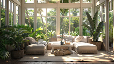 Serene sunlit conservatory with elegant wicker furniture and lush greenery. That the image is generated using AI.