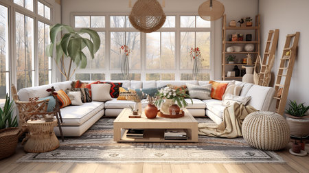 Interior design of Living Room in Bohemian style with Large windows decorated with Velvet, Wood, Rattan, Linen, Leather material. Beachy architecture. Generative AI AIG24.