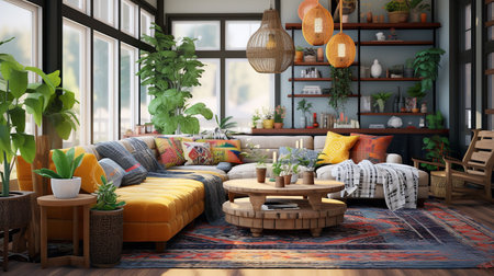Eclectic Boho-Chic: Artistic Living Room with Various Textures and Colors