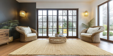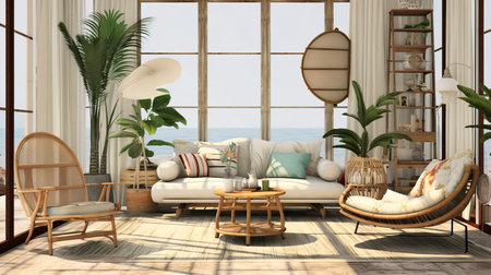 Living room decor, home interior design . Bohemian Coastal style with Large Windows decorated with Rattan and Wicker material . Generative AI AIG26.