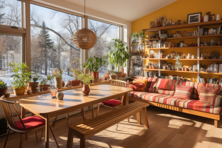 cozy warm home with plants interior of a chic country house with an open plan, wood finishes, warm colors and a family hearth. view of the recreation area for family and guests