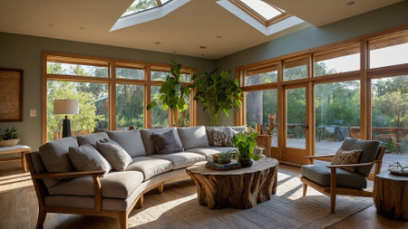 Bright and spacious living room that showcases a modern interior design with warm tones, natural light, and a serene view of surrounding greenery.