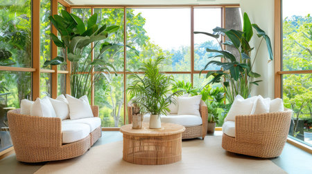 A serene sunroom with wicker furniture and lush greenery in a tropical setting