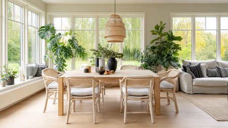Inviting and bright, this modern dining room features a light wooden table surrounded by stylish chairs, abundant indoor plants, and large windows that create a serene ambiance.